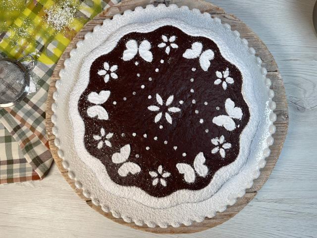 Per realizzare la decorazione sulla torta caprese ho utilizzato uno stencil davvero carino della marca Tescoma, un effetto scenografico semplicissimo da realizzare con semplice zucchero a velo.