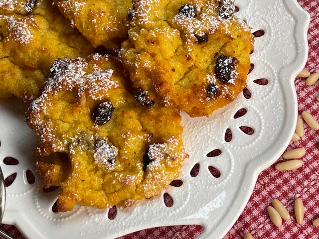 Questi biscotti nascono come dolce povero: un tempo si preparavano con ingredienti semplici e facilmente reperibili nelle case contadine — mais, un po’ di farina bianca, uvetta e strutto o burro quando c’era. Nel tempo, la ricetta si è raffinata, fino a diventare quella prelibatezza da pasticceria.